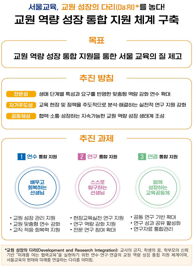 이를 위해 교원들이 자신의 역량 수준, 관심 분야에 따라 필요한 연수 과정 및 모듈을 선택해 이수할 수 있는 △수요자 선택형·맞춤형 직무연수 △자기주도적 역량 개발을 지원하는 서울학습연구년 특별연수 △수학·과학 우수교사 특별연수 등을 확대·강화한다.