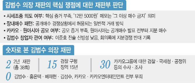 결국 법원이 검찰의 기소와 달리 이를 정상적인 경영 활동으로 인정하면서 큰 반전을 맞이했다. 이 고통스러운 여정은 카카오가 바닥까지 내려가며 스스로를 돌아보는 과정이기도 했다. 1심 무죄 판결로 카카오는 오랜 기간 드리웠던 ‘주가조작 기업’이라는 오명을 벗고 경영 정상화를 위한 기틀을 마련했다.